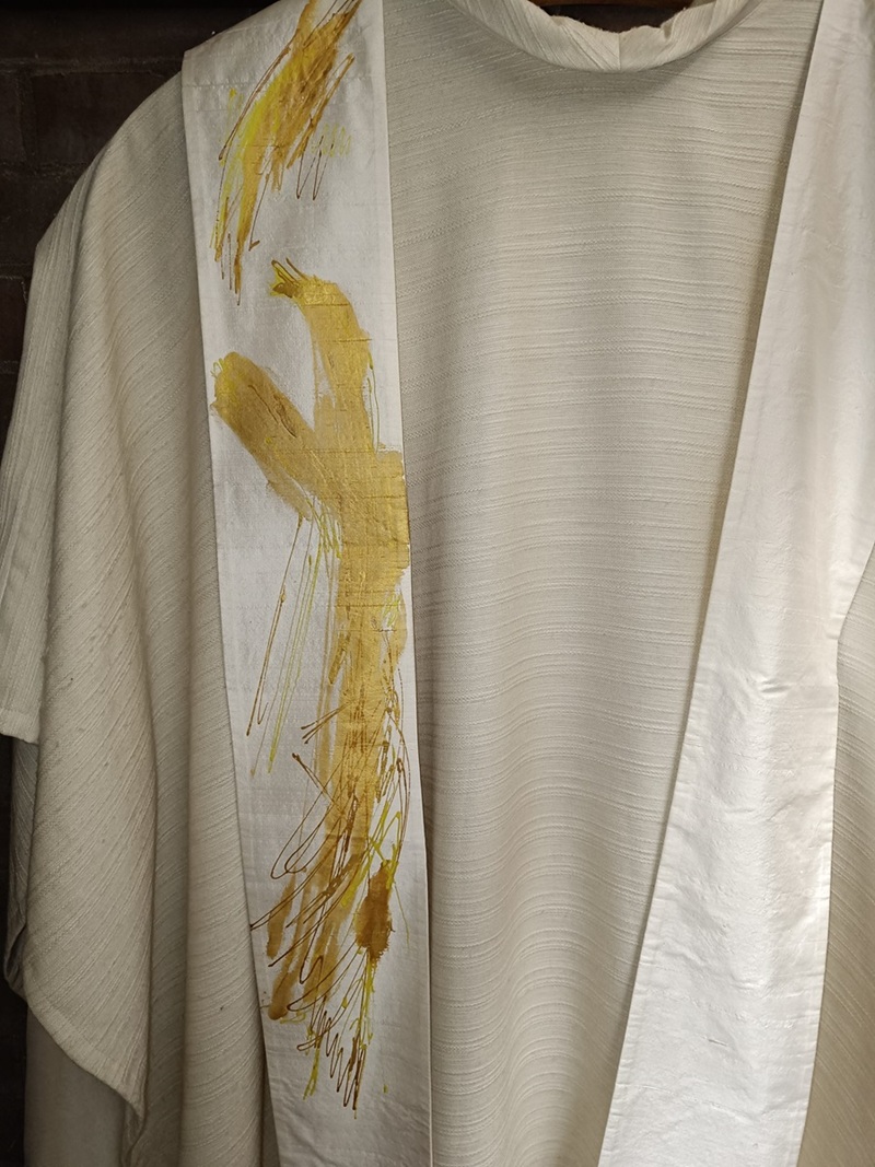 In einem ersten Schritt war der Entwurf dann wirklich die Grundlage für die Seidenmalerei auf meiner Primizstola. Später dann wurde er zu "meinem" Erkennungszeichen, so auch hier auf meiner Internetseite.